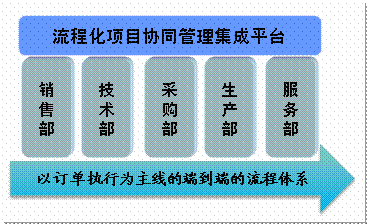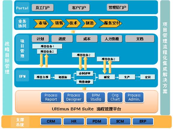 | 按订单生产管理解决方案的架构平台,它围绕公司基础协同业务,从项目型企业的市场线索、研发以及生产、服务交付等业务价值链的过程出发,利用Ultimus BPM Studio提供的流程管理平台,集成第三方企业级应用系统(如CRM、ERP、SCM等),以项目管理为核心,把项目管理和流程管理紧密结合起来。 |