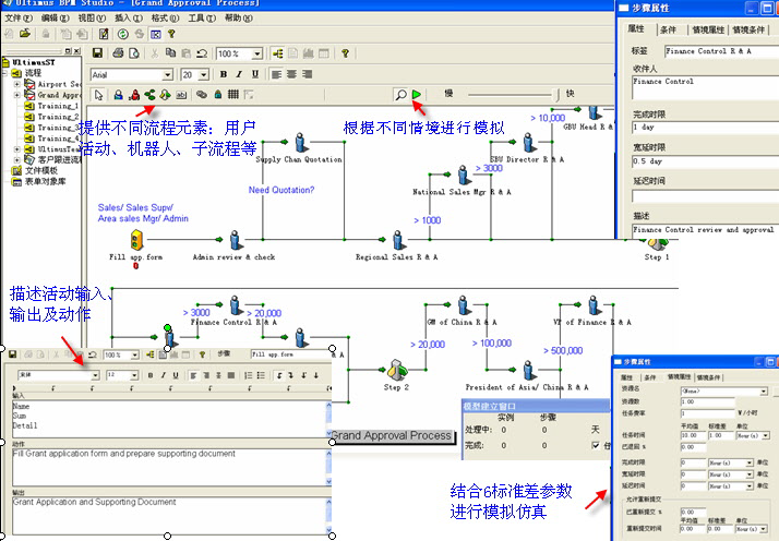 Ultimus Process Designer可发挥这种整合的分析功能,加强 Six Sigma 方法的效果。目前有愈来愈多的企业运用 Six Sigma 改善方案来降低营运成本和增加客户满意度。在企业试着探索各种改善机会的同时,他们也发现相对于设计或制造的流程,他们所推动的方案约有60-70% 是用于交易方面的业务流程。在 Six Sigma 方案中,黑带扮演的角色是绘制流程图、判断流程发生问题的根本原因以及找出如何突破绩效的方法。黑带使用“定义(Define)”、“衡量(Measure)”、“分析(Analyze)”、“改善(Improve)”和“控制(Control)”(DMAIC)等方法当作改造流程的准则。当业务人员设计好业务流程后,可用通过建立模型来评估其效率。用户可以按照各种情境来创建流程的模型,大幅改善流程的设计。报表可为用户提供重要的数据,以进行流程改善。以大量实例来建立流程模型,使用户可以了解某些步骤的异常任务负载状况,或是因停滞时间过长而中断流程的情况。 Ultimus Process Designer 可生成两种不同类型的报表:“流程层级报表”和“步骤层级报表”。流程层级报表提供整个流程的运作状况。步骤层级报表则能够辅助分析个别步骤的效能。以下是“步骤层级报表”和“流程层级报表”的说明。